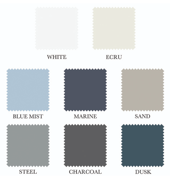 | Colour | White, Ecru, Blue Mist, Marine, Sand, Steel Grey, Charcoal, Dusk |