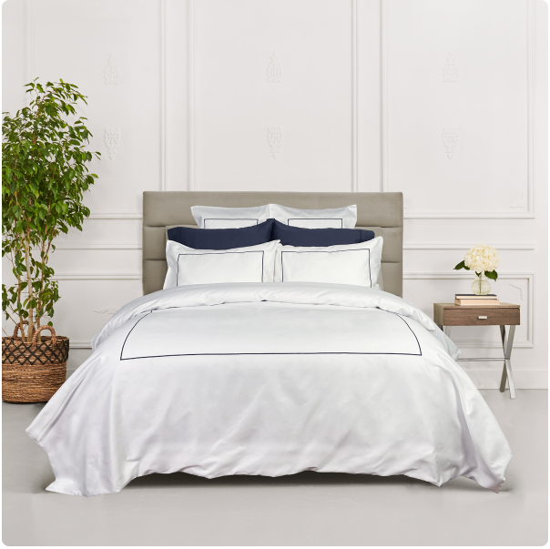 Duvet covers and shams feature an embroidered box stitch